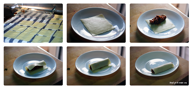 - Seguidamente cogemos un plato pequeño donde pondremos una lámina ya cocida, le echamos un poco de relleno de boloñesa en el centro y la cubrimos con la parte de arriba.