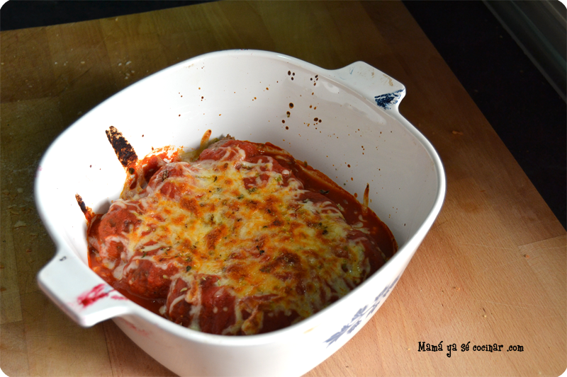 Una vez formadas todas las albóndigas con sorpresa toca freirlas en aceite bastante caliente pero sin colarse, que se torrarían y quedarían demasiado crudas en el interior. Mientras tanto tened la salsa de tomate casera lista(muy importante que la hagáis vosotros y no uséis tomate frito de brik) porque cuando se hayáis frito las albóndigas las tenéis que mezclar con la sala. Para ello, poned las albóndigas ya cocinadas en un recipiente apto para el horno, desmenuzadle media bola de mozzarella fresca por encima, poned algunas hojas de albahaca fresca y cubrid todo con la salsa de tomate.Albóndigas con salsa de tomate | Mamá ya sé cocinar