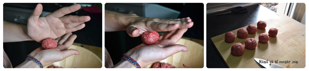 Albóndigas con salsa de tomate | Mamá ya sé cocinarUna sugerencia para formar las albóndigas: meted la carne aliñada al frigorífico una hora o así y os resultará más fácil formar las albóndigas, aunque se pueden hacer perfectamente recién mezclada la carne. Solo tenéis que hacer bolitas con las manos bien húmedas (para que se os pegue la masa lo mínimo posible), abrir un hueco en la bola e introducirle un trozo de quesito, cerramos el agujero y volvemos a redondear con las manos.