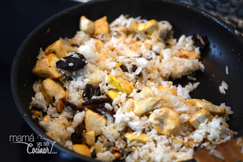 - Damos unas vueltas y seguidamente agregamos el arroz. Mezclamos bien y dejamos sofreír un minutos a fuego alto.