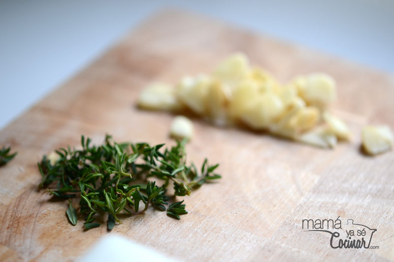 - Picamos el ajo finamente y el pollo y el tomate seco en daditos.