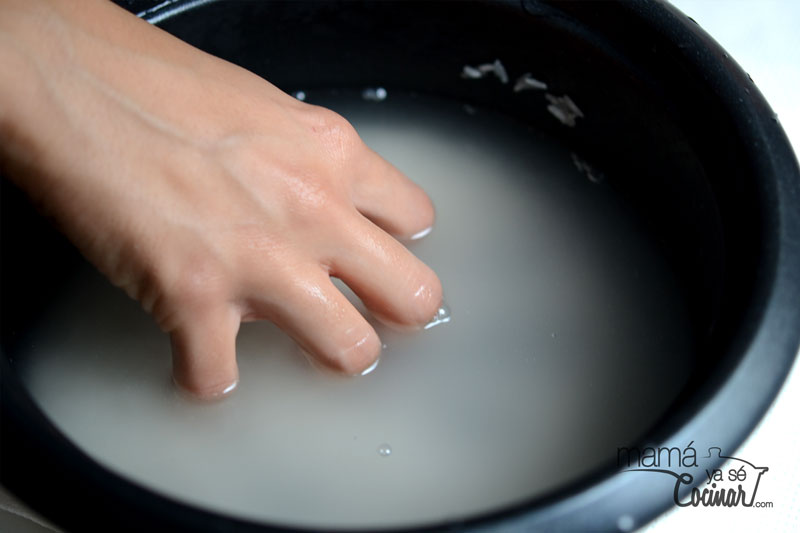 - Lavamos el arroz en un bol varias veces y removiendo con las manos, hasta que el agua salga transparente. Esto es muy importante dado que quitamos el exceso de almidón y conseguiremos el arroz suelto.