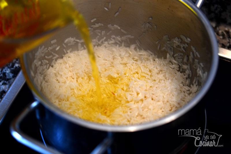 - Entonces agregamos el agua con el azafrán y la sal y dejamos cocer unos 10 minutos, hasta que se haya consumido el agua.