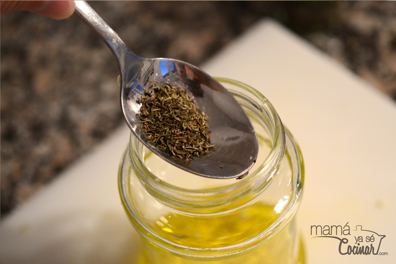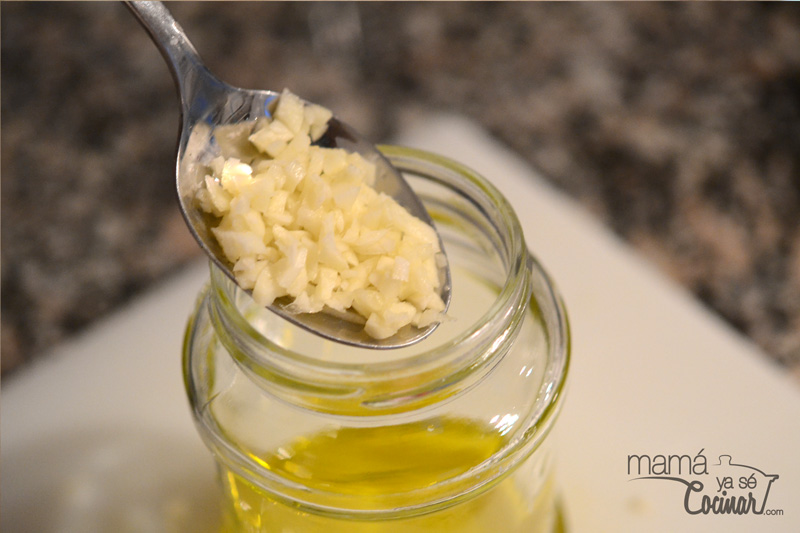 - Mientras picamos finamente un par de dientes de ajo y, junto con las hierbas y la sal, lo echamos en un tarro de cristal limpio.