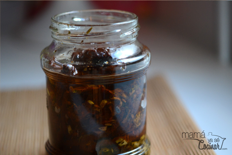 - Agregamos los tomates al tarro y cubrimos con aceite.