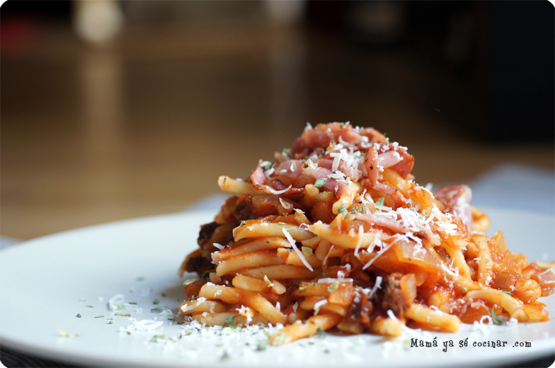 Esta es una de las salsas mas famosas de Roma y proviene de la ciudad de Amatrice (que quiere decir Amadora o Amante). Es una preparación muy sencilla, pero que viene muy bien para salirse un poco de la pasta con tomate de todos los días. Lo mejor es dejar el bacon bien crujiente para que contraste con la salsa y la textura de la pata.