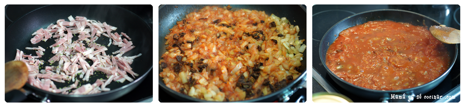 Mientras tanto ponemos en una sartén el bacón a fuego fuerte. No hace falta añadir aceite, ya que el bacon soltará bastante grasa. Cuando este bien dorado y crujiente lo retiráis y lo reserváis en un plato para el momento de servir. En el mismo aceite que ha soltado el bacon sofreís la cebolla picadita y la guindilla. Una vez que este transparente, podéis quitar la guindilla si no queréis la salsa muy picante. Agregáis el orégano y removéis unos minutos. Es el momento de añadir los tomates secos si os apetece. Entonces agregáis el tomate y cocináis unos diez minutos a fuego medio.