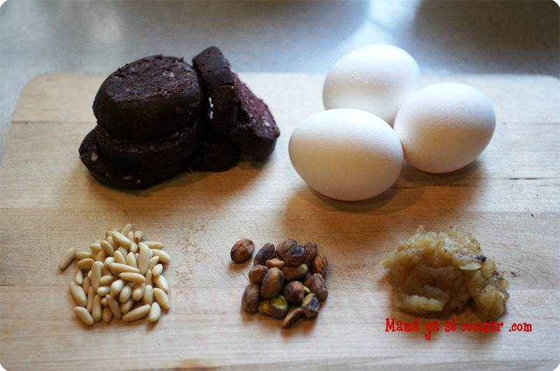 Tostamos un poco los piñones junto con los pistachos en la sartén. Cuando estén dorados, añadimos la morcilla sin la piel y con ayuda de una cuchara de madera la desarmamos en la sartén. Sofreímos bien y cuando ya esté casi a punto echamos la compota de manzana. Removemos todo muy bien y con el fuego muy bajo, añadimos los huevos y seguimos removiendo. La idea es que el huevo se haga con el calor residual de la sartén para que se quede medio cuajado y el revuelto no quede seco.