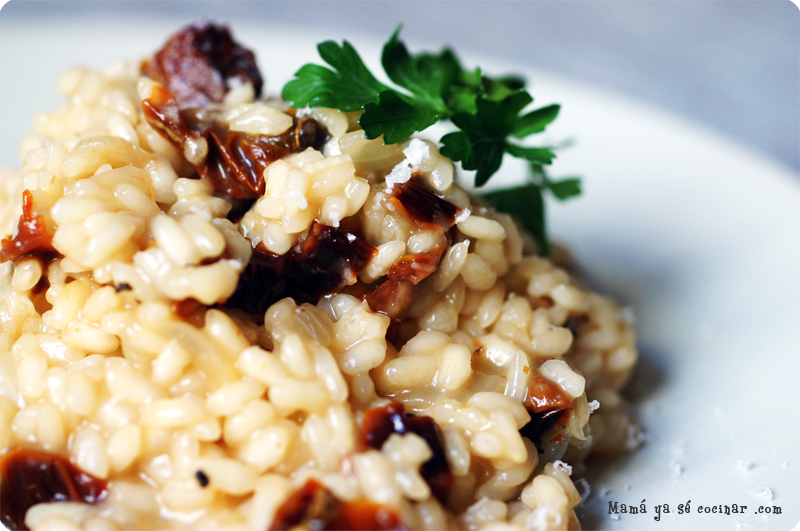 He aquí una evolución del básico risotto bianco. Me apetecía un buen arroz y no tenía nada en la nevera, por lo que miré en la despensa y me encontré con unos tomates secos italianos que me había traído mi madre de regalo de Roma. No sabía si quedaría bien, pero la verdad es que me he sorprendido de lo bueno que ha salido! Lo mejor es cuando muerdes un trozo de tomate y suelta todo su sabor “unami” que te deja perplejo! Como siempre, muy importante un buen caldo casero.